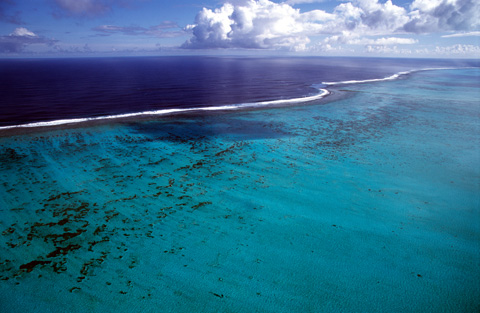 | 環礁の外側は濃紺の太平洋。環礁の内側は荒々しい外洋とはうって変わって穏やかなラグーンを形成し、明るい光、澄んだ水、そして白砂が織りなすアクアブルーの静かな世界が広がっていました。 |